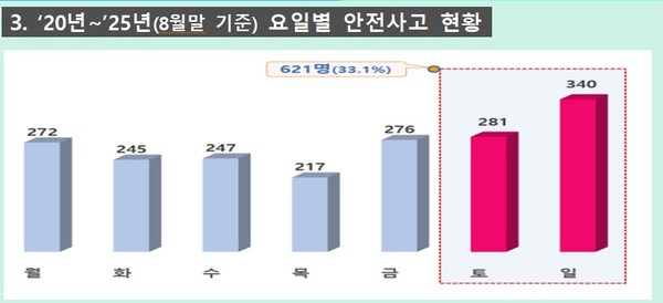 사고 발생은 주말(금~일) 사고가 전체의 46.0%(190건)를 차지했으며, 하산 시간대(오후 12시~4시)에 48.7%(201건) 가 집중 발생하는 것으로 나타났다.