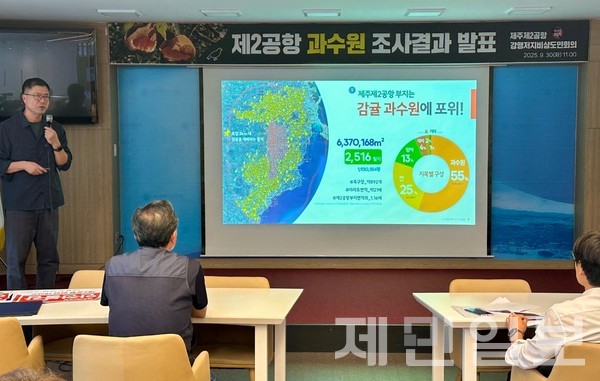 제주 제2공항 강행저지 비상도민회의는 30일 오전 제주도의회 도민카페에서 기자회견을 열고 "제2공항 예정지 총 2516 필지 630만㎡ 토지가 감귤 과수원으로 확인됐다"고 밝혔다.