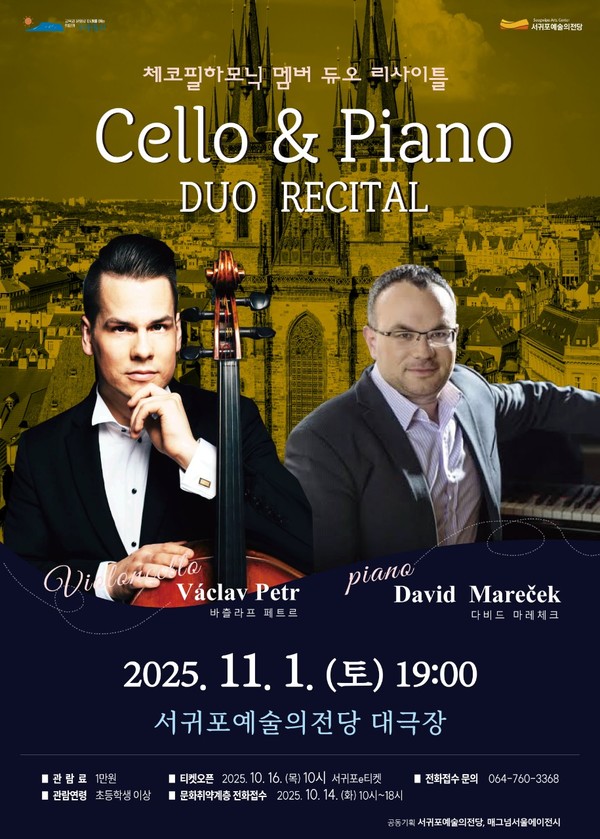 서귀포시는 11월 1일 오후 7시, 서귀포예술의전당 대극장에서 체코필하모닉오케스트라 멤버 '첼로·피아노 듀오 리사이틀'을 개최한다고 밝혔다.