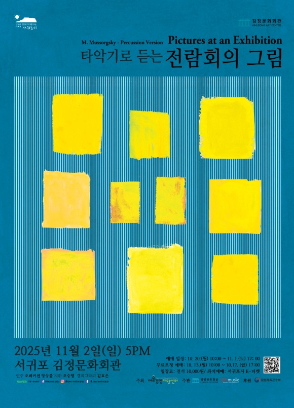 오는 11월 2일 오후 5시 김정문화회관에서 개최되는 이번 공연은 러시아 작곡가 무소르그스키의 대표작 '전람회의 그림'을 타악기 앙상블로 재구성하고, 해설과 캘리그라피, 영상을 결합한 융복합 클래식 공연으로 음악, 영상, 시각 예술이 어우러진 무대 속에서 작품의 배경 등을 흥미롭게 감상할 수 있는 기회를 제공한다.