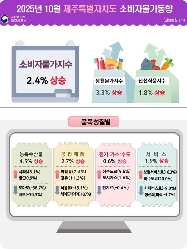 4일 국가데이터처가 발표한 ‘2025년 10월 제주특별자치도 소비자물가동향’에 따르면 10월 제주지역 소비자물가지수는 117.04로 지난해 같은 기간에 비해 2.4% 상승했다.