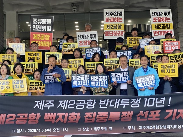 제주제2공항강행저지비상도민회의(이하 도민회의)는 5일 제주도청 앞에서 기자회견을 갖고 “제주 제2공항 반대투쟁 10년을 맞아 도민결정권 쟁취와 제2공항 백지화를 위한 집중투쟁을 선포한다”고 밝혔다.