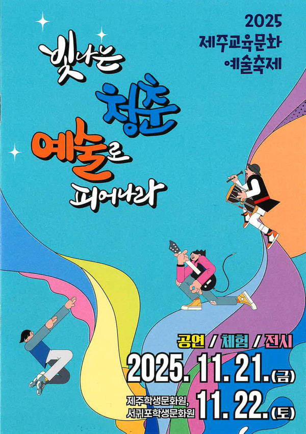 제주도교육청은 오는 21일부터 22일까지 제주시학생문화원과 서귀포시학생문화원에서 ‘2025 제주교육문화예술축제’를 연다고 9일 밝혔다. 올해 축제는 ‘빛나는 청춘, 예술로 피어나라’를 주제로 학생과 교직원이 함께하는 공연·전시·체험의 장으로 꾸며진다.
