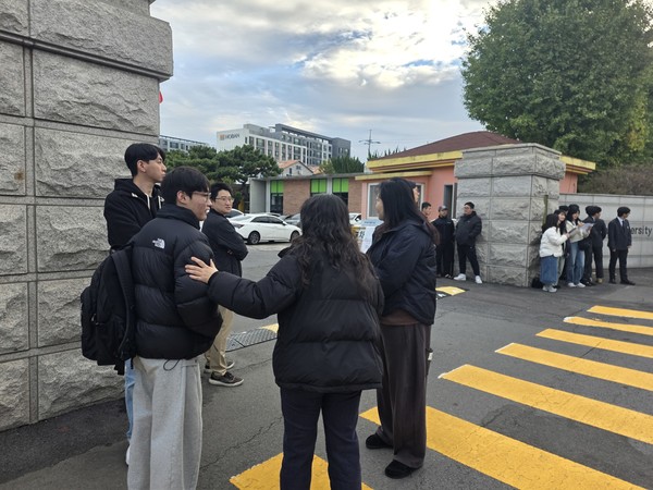 2026학년도 대학수학능력시험일인 13일 오전 제주95지구 남녕고 시험장 정문 앞에서 후배들이 시험장으로 들어가는 선배들을 위한 응원피켓을 들고 있다. 조병관 기자