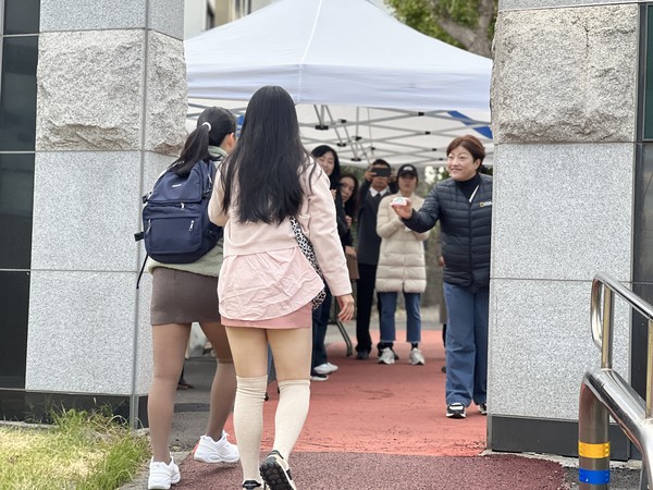 2026학년도 대학수학능력시험일인 13일 오전 서귀포96지구 서귀포여고 시험장 정문 앞에서 오순문 서귀포시장이 수험장으로 들어가는 수험생을 응원하고 있다. 김법수 기자