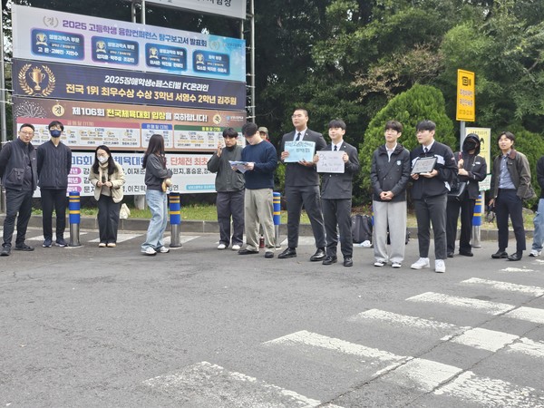 2026학년도 대학수학능력시험일인 13일 오전 제주95지구 제주제일고 정문에서 김광수 교육감과 제주제일고 학생들이 수험생을 응원하고 있다. 김은수 기자