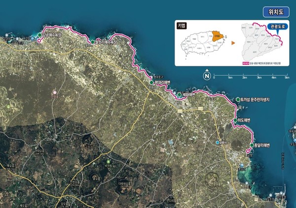 이 중 제주시 구좌읍 숨비해안로는 구좌읍 김녕리 김녕해수욕장부터 종달리해변까지 이어지는 총 24.7㎞ 길이의 해안도로다.