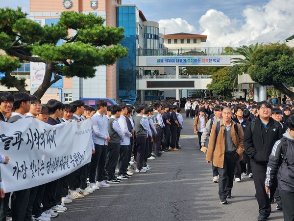 행사에 참여한 1·2학년 후배들은 교내 응원 구호를 외치고 제주제일고 응원가 '차돌가'를 제창하며 선배들의 선전을 기원했다.