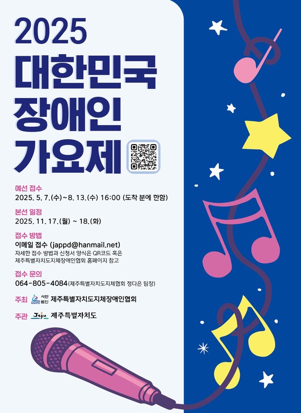 제주도지체장애인협회(협회장 한태만)는 '2025 대한민국장애인가요제'를 17일부터 18일까지 메종글래드 제주 컨벤션홀에서 개최한다고 이날 밝혔다.