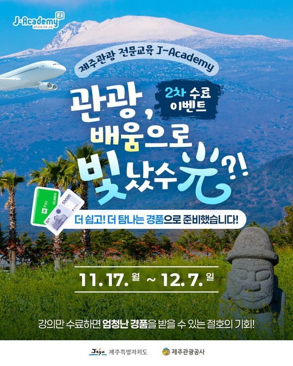 제주관광공사(사장 고승철)는 오는 12월 7일까지 '제주관광 전문교육 J-Academy' 온라인 플랫폼에서 교육 수료 이벤트를 진행하고 있다고 17일 밝혔다.