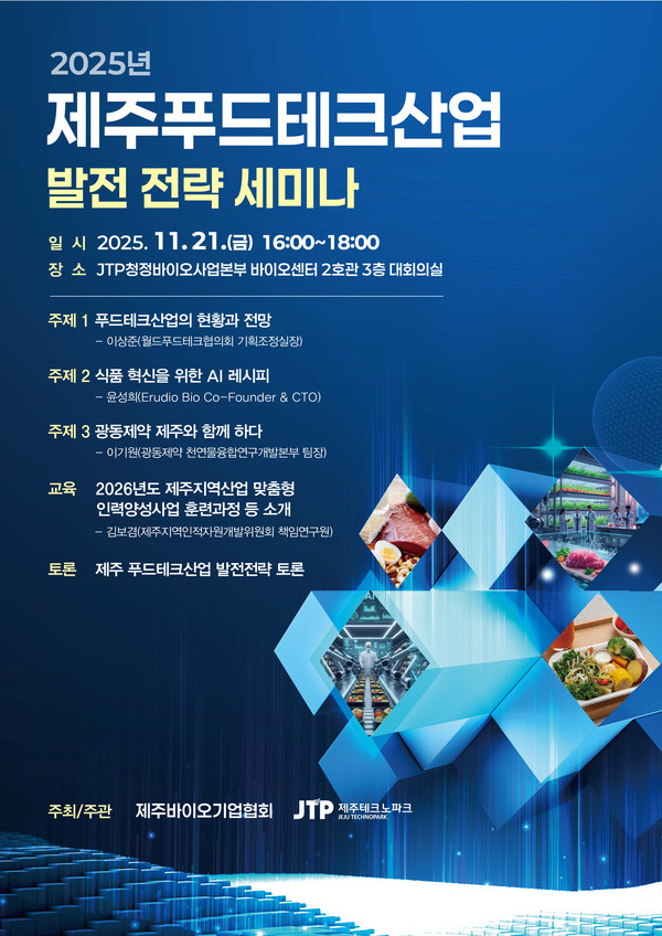 제주테크노파크(원장 지영흔, JTP)는 제주바이오기업협회(회장 김성후)와 함께 오는 21일 오후 4시 JTP 청정바이오사업본부 바이오센터 2호관 3층 대회의실에서 '제주 푸드테크 산업 생태계 조성 및 활성화'를 주제로 2025년 제주푸드테크산업 발전 전략 세미나를 개최한다.