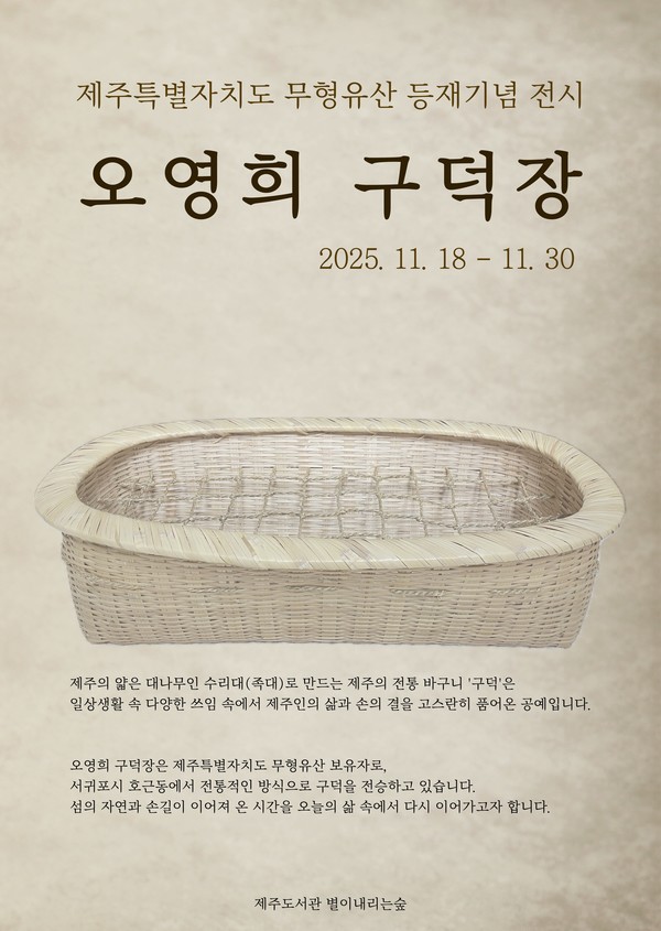 제주도서관은 20일 '별이 내리는 숲'에서 제주도 무형유산 구덕장 오영희 보유자 등재를 기념해 전시와 연계 교육 프로그램을 운영한다고 밝혔다. 제주의 고유한 죽공예인 '구덕'의 가치를 시민에게 소개하고, 어린이들이 전통문화를 직접 보고 배우는 기회를 마련하기 위한 자리다.