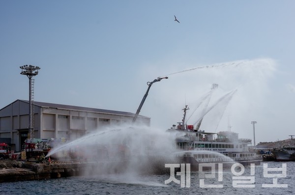 제주소방안전본부는 25일 서귀포항 제3부두 일대에서 선박 화재 대응능력 강화를 위한 합동 훈련을 진행했다.