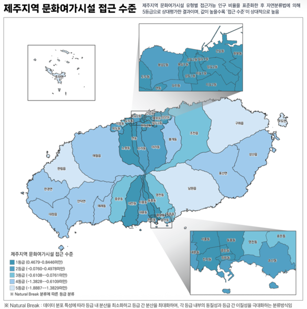 반면 한림읍·구좌읍·한경면·추자면·우도면·봉개동·남원읍은 최하위 등급에 분포하며 전반적인 접근 취약 지역으로 확인됐다.