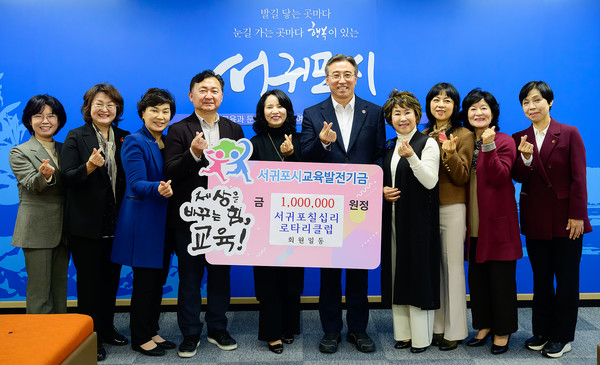 서귀포칠십리로타리클럽(회장 한순자)은 최근 서귀포시청 접견실에서 (재)서귀포시교육발전기금(이사장 김문수)에 교육발전기금 100만원을 기탁했다. 서귀포칠십리로타리클럽은 2014년부터 서귀포시교육발전기금 모금에 참여해 2025년 현재까지 총 1100만원을 기탁했다.