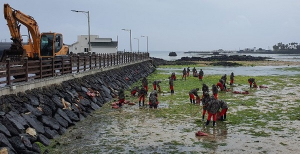 조천읍(읍장 김덕홍)과 해병대9여단(여단장 진규상)이 해안경관을 훼손하는 파래 수거를 집중 추진했다.조천읍은 지난 17일 신흥리 일대에서 장병 40여명과 바다환경지킴이 등이 참여한 가운데 파래 수거를 실시했다.해안을 뒤덮은 파래가 경관 훼손은 물론 악취 발생으로 주민과 관광객들에게 불편을 주는데 따른 조치다.해병대9여단은 최근 괭생이모자반 수거에도 3차례 투입됐다.조천읍은 앞으로도 파래 수거를 지속 추진하는 등 여름철 해안 정화에 집중키로 했다.