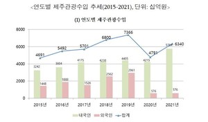 지난해 제주 관광 수입이 코로나19 이전 수준까지 회복된 것으로 나타났다.제주도가 제주연구원(강영준 책임연구원)에 의뢰해 수행한 2021년 제주관광수입 추계 결과 지난해 도내 관광수입은 6조3402억원으로 잠정 추계됐다.이는 2020년 4조7909억원 대비 32.3% 증가한 수치다.도는 관광수입 증가 요인으로 사회적 거리두기 완화, 해외 대체 수요 국내 집중 등에 따른 내국인 제주 방문객 증가를 들었다.지난해 내국인 지출은 2020년 대비 1조5485억원 증가한 5조7639억원으로 지난해보다 36.7% 늘며 전체적인 회복을 이끌었다