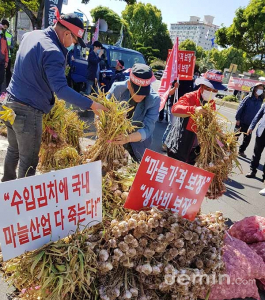 제주마늘생산자협회 13일 물량 확대·㎏당 3200원 보장 요구마늘값 폭락으로 어려움을 겪고 있는 제주지역 마늘농가들이 정부수매 물량 확대와 생산단가 보장을 요구했다.제주마늘생산자협회(회장 박태환)는 13일 대정농협과 제주도청 앞에서 각각 기자회견을 갖고 "마늘농가들은 수확에 여념이 없지만 기쁨은 간데 없고 한숨과 분노만 놓여 있다"며 "애써 키워온 마늘을 정부는 과잉생산됐다며 가격이 떨어지니 키운 마늘을 갈아엎으라 한다"고 말했다.이어 "숫자놀음으로 만들어내는 농업대책은 실효성이 없다"며 "통계를 기다리다 발표한 정부대