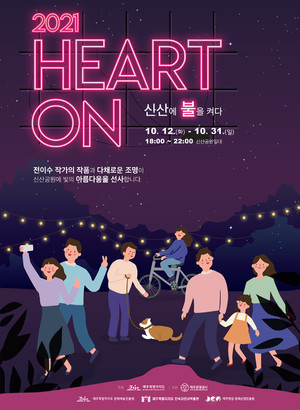 제주시 도심 속 휴식공간인 신산공원에서 새로운 야간문화관광 콘텐츠가 진행된다.제주도와 제주관광공사(사장 고은숙)는 12일부터 31일까지 20일간 코로나19로 지친 일상에 새로운 활력을 전하는 '하트온, 신산에 불을 켜다'를 개최한다고 밝혔다.신산공원 일대에서는 3년째 야간경관 사업이 추진되고 있다. 이번 행사는 문예회관 사거리에서 자연사박물관까지 도로 조명과 공원 북쪽 메인행사장(옛 호남석재사거리 공원 부근)에서 진행돼 다양한 야간 볼거리를 즐길 수 있다.행사장에서는 전이수 동화작가의 작품을 야간 조명과 함께 전시하고, 직접 그린