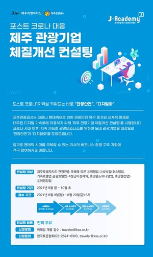 '제주관광 아카데미(J-Academy)'가 포스트코로나시대 제주 관광업계의 경쟁력을 키우기 위한 알찬 프로그램을 선보인다.제주도와 제주관광공사(사장 고은숙)는 제주 관광업계 지원을 위한 제주관광 아카데미 사업의 올해 핵심 과제인 '관광기업 체질개선 컨설팅'과 '관광 종사자 대상 온라인 교육사업'을 이달 본격화한다.기업 컨설팅은 코로나19 이후 관광객들의 안전 욕구와 세계적 화두인 디지털 가속화에 대응하기 위한 업계의 혁신 지원에 중점을 두고 있다.대상은 제주도 관광진흥조례에 따른 △여행업 △호스텔업, 가족호텔업, 관광호텔업(4성급