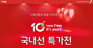 티웨이항공 창립10주년을 맞아 국내선 특가 이벤트를 진행한다.오는 9월 1일부터 신규 취항하는 부산-제주 노선도 이벤트에 포함돼 다양한 국내선 항공권을 구매할 수 있는 기회를 제공한다.이번 이벤트는 오는 27일까지 티웨이항공 홈페이지(www.twayair.com)와 모바일 앱(웹)을 통해 진행한다. 탑승 기간은 9월 1일부터 10월 31일까지다.티웨이항공은 현재 △김포-제주△부산-제주 △대구-제주 △광주-제주 △청주-제주 △김포-부산 △부산-양양 △광주-양양 등 8개의 국내선을 운항하고 있다.이번 이벤트를 통한 특가 편도 총액운임을