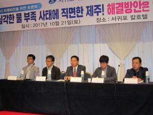 서귀포시연합청년회(회장 진석준)는 21일 서귀포칼호텔에서 이상순 서귀포시장, 김용범·김영보 도의원, 김우남 전 국회의원, 회원 등 60여명이 참석한 가운데 ‘심각한 물 부족사태에 직면한 제주, 해결방안은 없는가’를 주제로 서귀포시 미래 비전을 위한 토론회를 개최했다.이날 종합토론에서 김동주 에너지기후정책연구소 연구기획위원은 “현재 제주의 물문제는 수량의 문제, 수질의 문제, 사회적 문제로 요약할 수 있다”며 “이러한 문제 해결을 위해서는 관광객 수용량과 적정한 요금체계 정립이 필요하다”고 제시했다.또 이영웅 제주환경운동연합 사무처장