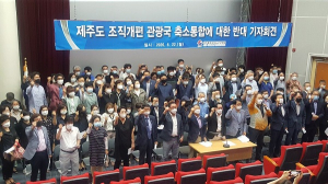 관광협회·관광학회·전세버스·렌터카·호텔·안내사 등 22일 기자회견관광국 전문성·역할, 도 재정위기 자구노력 강조…인력·예산 확대 요구관광국을 문화관광국으로 통폐합하는 제주특별자치도의 행정조직개편에 대해 제주 관광인들의 반대 목소리가 커지고 있다.제주도관광협회 18개 분과위원회와 제주관광학회, 전세버스·렌터카·호텔·안내사 등 업종별 단체들은 22일 제주웰컴센터에서 기자회견을 갖고 '제주도 관광국 축소통합에 대한 관광인들의 반대' 입장문을 발표했다.이날 참석한 관광인들은 2016년 문화관광스포츠국에서 관광국이