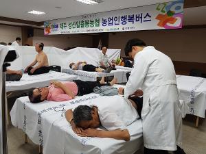 농협제주지역본부(본부장 고병기)·농림축산식품부·㈔농촌사랑범국민운동본부가 공동 주최하고 성산일출봉농협(조합장 현용행)이 주관하는 ‘농업인 행복버스’가 11일 성산지역에서 운행됐다.올해 여섯 번째로 실시하는 농업인 행복버스는 이날 성산일출봉농협에서 주민 500명을 대상으로 건강상담과 한방치료, 장수사진 촬영 등을 실시했다.