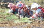 봄 햇살 아래 애월읍 하귀리 농민들이 차광모를 눌러 쓰고 여름에 수확할 대파 모종을 옮겨 심고 있다.