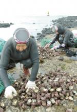 화창한 날씨를 보인 11일 한경면 용당리 해안. 해녀들이 봄내음이 물씬 나는 바닷속에서 갓 잡아올린 소라 선별작업을 하고 있다.