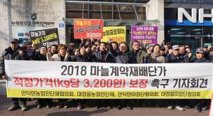대정.안덕 농민단체 29일 기자회견 ㎏당 3200원 보장 요구대정읍과 안덕면 등 제주지역 마늘주산지 농가들이 최근 결정된 2018년산 마늘계약단가가 생산비에도 미치지 못한다며 농가현실을 반영하라고 요구했다.한농연 및 여성농민회 등 대정읍과 안덕면 농민단체들은 29일 농협중앙회 제주지역본부 앞에서 기자회견을 열고 “농협은 마늘협동마케팅을 출범시키면서 농협경제지주에 위탁방식으로 농가수취가격을 높이겠다고 선언했다”며 “하지만 마늘계약재배 권장단가는 생산비도 안되는 ㎏당 2300원이 제시됐다”고 밝혔다. 또 “마