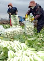 다소 쌀쌀한 날씨를 보인 20일 애월읍 하귀리에서 농민들이 찬바람속에서도 애기배추를 수확하고 있다.