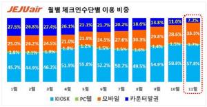 1월 대비 11월 모바일 탑승 수속 비중 8.3%p, 키오스크 12.1%p 증가 공항 내 무인 수속이 보편화되면서 국내선 항공편 탑승 수속을 위해 유인 카운터를 이용하는 비중이 계속 줄어들고 있는 것으로 나타났다.제주항공(대표이사 이석주)은 지난 11월부터 이용객 편의를 돕고 카운터 혼잡을 줄이기 위해 모바일 탑승권이나 키오스크(무인단말기) 등을 이용한 스마트체크인 활성화 캠페인을 시작했다.제주항공에 따르면 캠페인 한달만에 유인 카운터 수속 비중은 10월 11%에서 11월 7.2%로 3.8%p 감소했다. 지난 1월 2