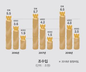 제주관광공사, 2018년 기준 제주 관광동향에 관한 연차보고서 발간 제주를 찾는 관광객은 줄고 있지만 제주 관광 수입은 증가하는 것으로 나타났다.제주관광공사가 10일 발간한 '2018년 기준 제주 관광동향에 관한 연차보고서'에 따르면 2018년 제주관광 조수입은 6조5390억원(잠정치)으로 추계 됐다. 이는 2017년 5조7000억원(확정치)에 비해 8390억원이 증가한 수치다.내국인 관광객으로 인한 관광 조수입은 4조300억원으로 전년 4조1740억원에 비해 1440억원이 감소했다. 내국인 감소는 경기