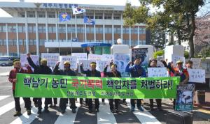 전국농민회총연맹 제주도연맹 등 도내 농민단체들은 21일 제주지방경찰청에서 기자회견을 열고 강신명 경찰청장의 파면을 촉구했다.이들 단체는 "지난해 11월 열린 1차민중총궐기대회에서 70대 농민 백남기씨가 경찰이 쏜 물대포에 맞아 지금까지 사경을 헤매고 있다"며 "그러나 정부와 경찰은 아무런 책임을 지지 않고 있으며, 검찰은 조사 조차 나서지 않고 있다"고 주장했다.이어 "쓰러져 누워있는 백남기씨는 이 나라 농업이며 농민의 모습"이라며 "우리는 '내가 백남기다'라는 절절한 심정으로 대통령의 사과와 함께 강신명