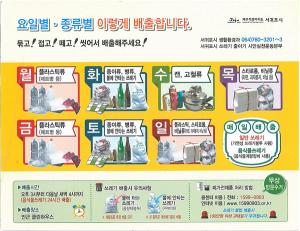 서귀포시는 재활용품 요일별 배출제 개선에 따라 시민들이 쉽게 배출할 수 있도록 홍보물을 제작해 보급한다고 27일 밝혔다.이번 보급하는 홍보물은 △냉장고 부착용 자석스티커 △외국인 대상 홍보물 △어르신들을 위한 포스터 등 3종 세트다.시는 우선 재활용품 요일별 배출제 개선 사항을 알리기 위해 냉장고 부착용 자석스티커(22㎝×17㎝)를 제작해 다음달까지 우편을 통해 배부할 계획이다.자석스티커에는 △요일별 배출 품목과 쓰레기 배출시 유의사항 △폐가전제품 처리방법 등을 알 수 있도록 제작됐다.또 외국인들도 요일별 배출제를 알 수
