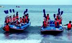 졸업여행을 온 충북 천안외국어대학교 마케팅정보과 학생들이 2일 이호해수욕장을 찾아 레프팅을 체험하며 즐거운 시간을 보내고 있다.