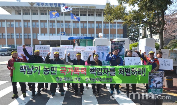 전국농민회총연맹 제주도연맹 등 도내 농민단체들은 21일 제주지방경찰청에서 기자회견을 열고 강신명 경찰청장의 파면을 촉구했다.