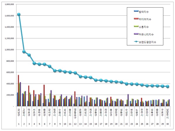 기초단체 브랜드평판 분석은 참여지수, 미디어지수, 소통지수, 커뮤니티지수로 구분해 브랜드평판지수를 산출했다.