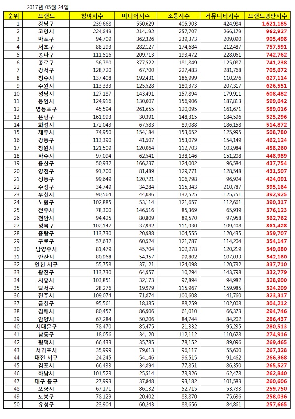 분석결과 2017년 5월 기초단체 브랜드평판 50위 순위에서 1~10위는 강남구, 고양시, 마포구, 서초구, 송파구, 종로구, 강서구, 청주시, 수원시, 성남시다.
