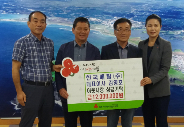 김영호 한국메탈㈜ 대표이사(사진 오른쪽 두 번째)가 15일 성산읍에 이웃돕기 성금 1200만원을 기탁했다.