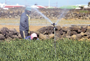 도내 서부지역에 계속되는 가뭄으로 수확을 앞둔 마늘농가는 뿌리를 뽑을 때 마늘이 잘려나가는 걱을 방지하기 위해 스프링클러를 이용한 물주기 작업이 한창이다.