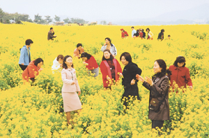 징검다리 연휴를 맞아 제주를 찾은 관광객들이 성산일출봉 일대의 유채꽃밭에서 노란 꽃속에 묻혀 남국의 정취를 만끽하고 있다. 이번 연휴에는 관광객 3만5000여명이 제주를 찾을 것으로 예상돼 관련업계가 반짝호황을 기대하고 있다.