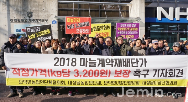 또 “마늘제주협의회는 계약재배단가를 권장단가보다 400원 올린 2700원으로 결정했지만 농민 입장에서는 인정할 수 없다”며 “인건비와 비싼 종자대, 비료와 농역 비용 등 생산비용은 한없이 높아가는 현실을 반영하지 않았다”고 지적했다.