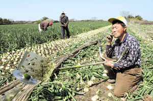 조생양파 산지폐기가 한창인 가운데 19일 애월읍 신엄리 양파밭에는 폐기작업을 하던 농부가 서러운 마음에 일손이 잡히지 않는 듯 갈아 엎은 양파 위에 주저앉아 담배를 피워물고 있다. 양파산지폐기는 18일 현재 도 전체적으로 61.7% 진행됐다.