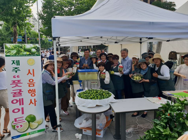 농가주부모임 제주특별자치도연합회(회장 김복심)와 고향주부모임 제주특별자치도지회(회장 오옥성) 회원 30명은 7일 서울 여의도에 소재한 농협재단빌딩 야외마당에서 서울시민을 대상으로 풋귤 홍보에 나섰다.
