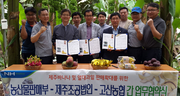 농협경제지주 농산물판매부와 제주농협조합공동사업법인(대표 고성만), 고산농협(조합장 이성탁)은 최근 제주시 한경면에 있는 바나나농장에서 '제주 바나나 및 열대과일 판매확대를 위한 업무협약(MOU)'을 체결했다.