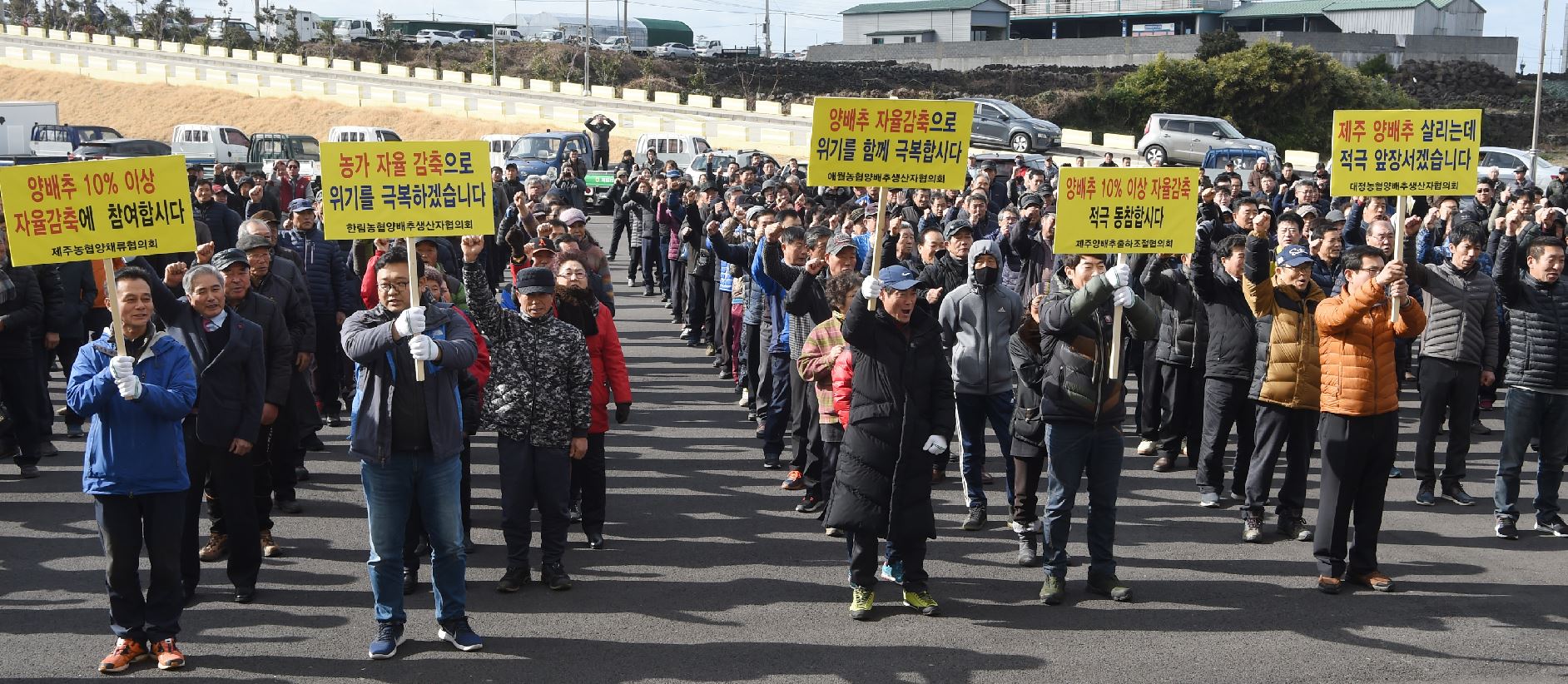 도내 양배추 주산지인 애월·한림·대정 등 양배추 생산자 500명 등이 참석한 가운데 열린 이날 결의대회에서 농민들은 재배 면적 가운데 10%에 해당하는 165㏊, 물량으로는 9000t 정도를 산지에서 선제 폐기하기로 뜻을 모았다.