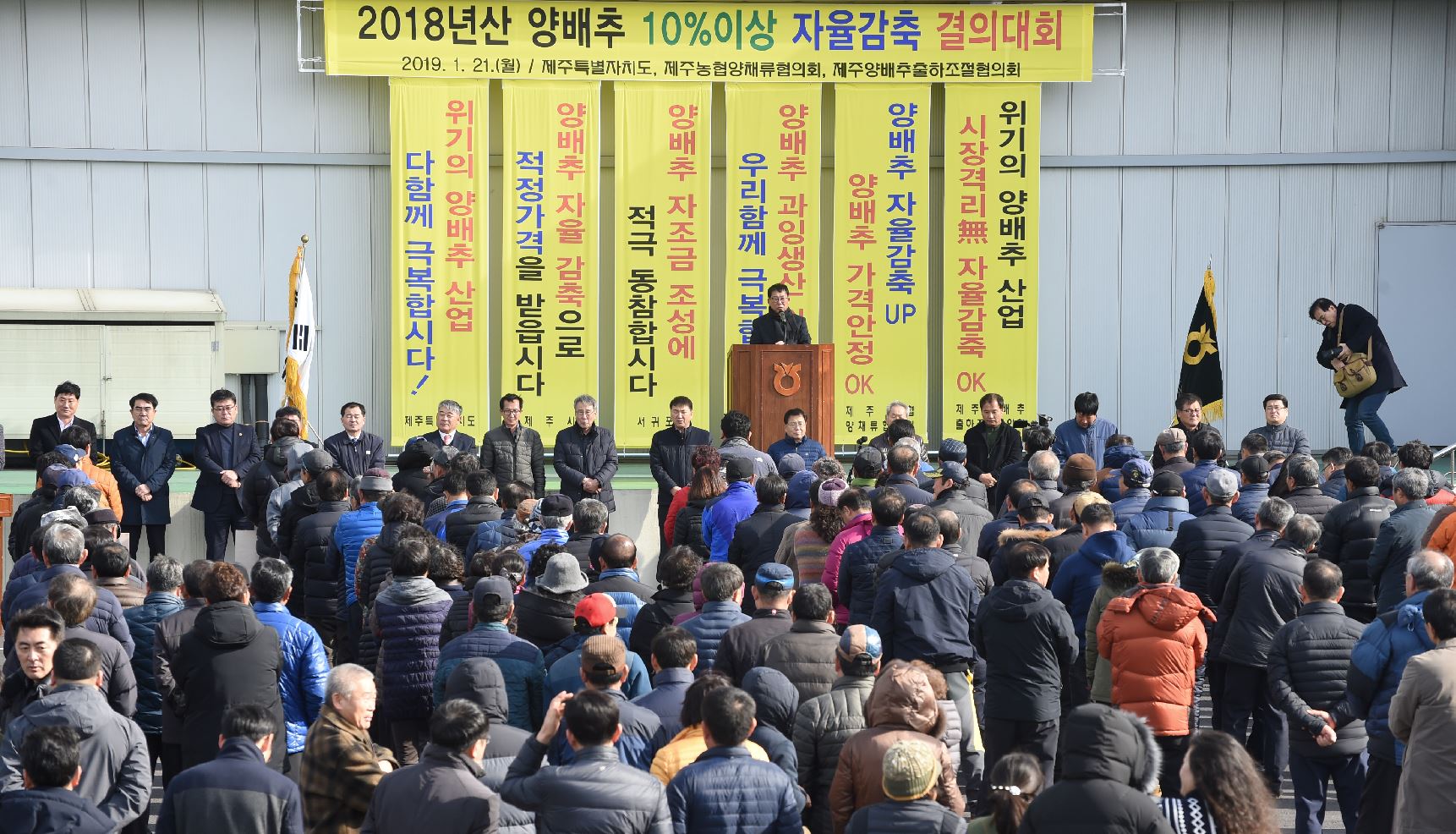 제주농협양채류협의회와 제주양배추출하조절위원회는 21일 애월농협 농산물산지유통센터에서 '양배추 10% 이상 자율감축 결의대회'를 개최했다.