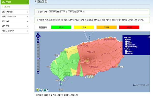 도농기원이 제공하는 병해충예층모형 기준으로 제주 동부 지역에 걸쳐 감귤 궤양병 4단계 경보가 내려지는 등 발생 가능성이 높은 실정이다. 감귤궤양병 피해 우려는 적은 상황이지만 최근 기후 상황을 볼 때 안심하기 어렵다. 지난 겨울 평균 기온이 0.7도로 전년(영하 1.3도)보다 높았고, 올봄 고온다습한 날씨가 이어지는 등 해충 발생밀도가 예년 수준을 크게 웃돌 것으로 전망되고 있다.
